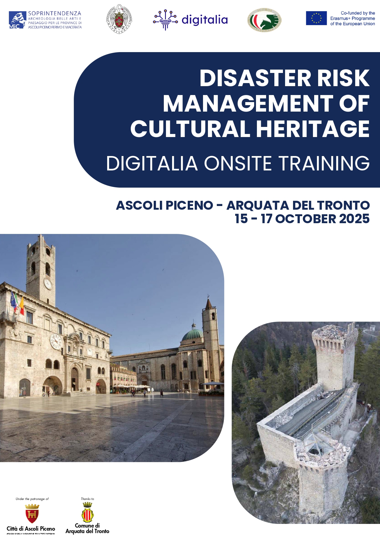 Si terrà ad Ascoli Piceno e Arquata del Tronto dal 15 al 17 ottobre 2025 l’Evento formativo “DISASTER RISK MANAGEMENT OF CULTURAL HERITAGE” dedicato ai temi della tutela della gestione del rischio del patrimonio culturale.