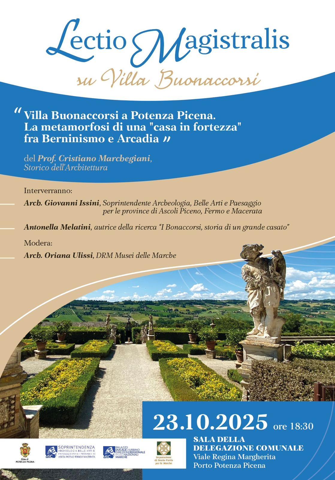 Si terrà a Potenza Picena 23 ottobre 2025 ore 18.30 presso la Sala della Delegazione Comunale Viale Regina Margherita a Porto Potenza la Lectio Magistralis “Villa Buonaccorsi a Potenza Picena. La metamorfosi di una “casa in fortezza” fra Berninismo e Arcadia “ a cura del Prof. Cristiano Marchegiani – Storico dell’Architettura